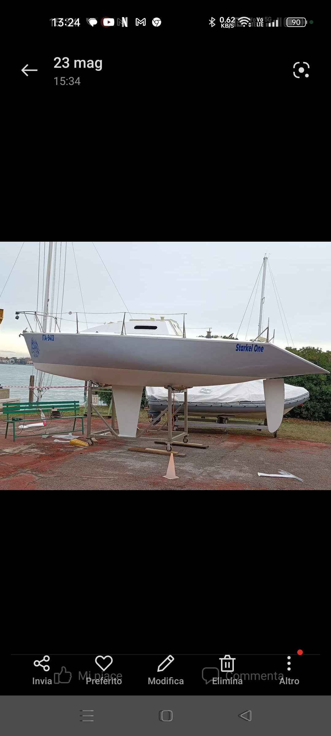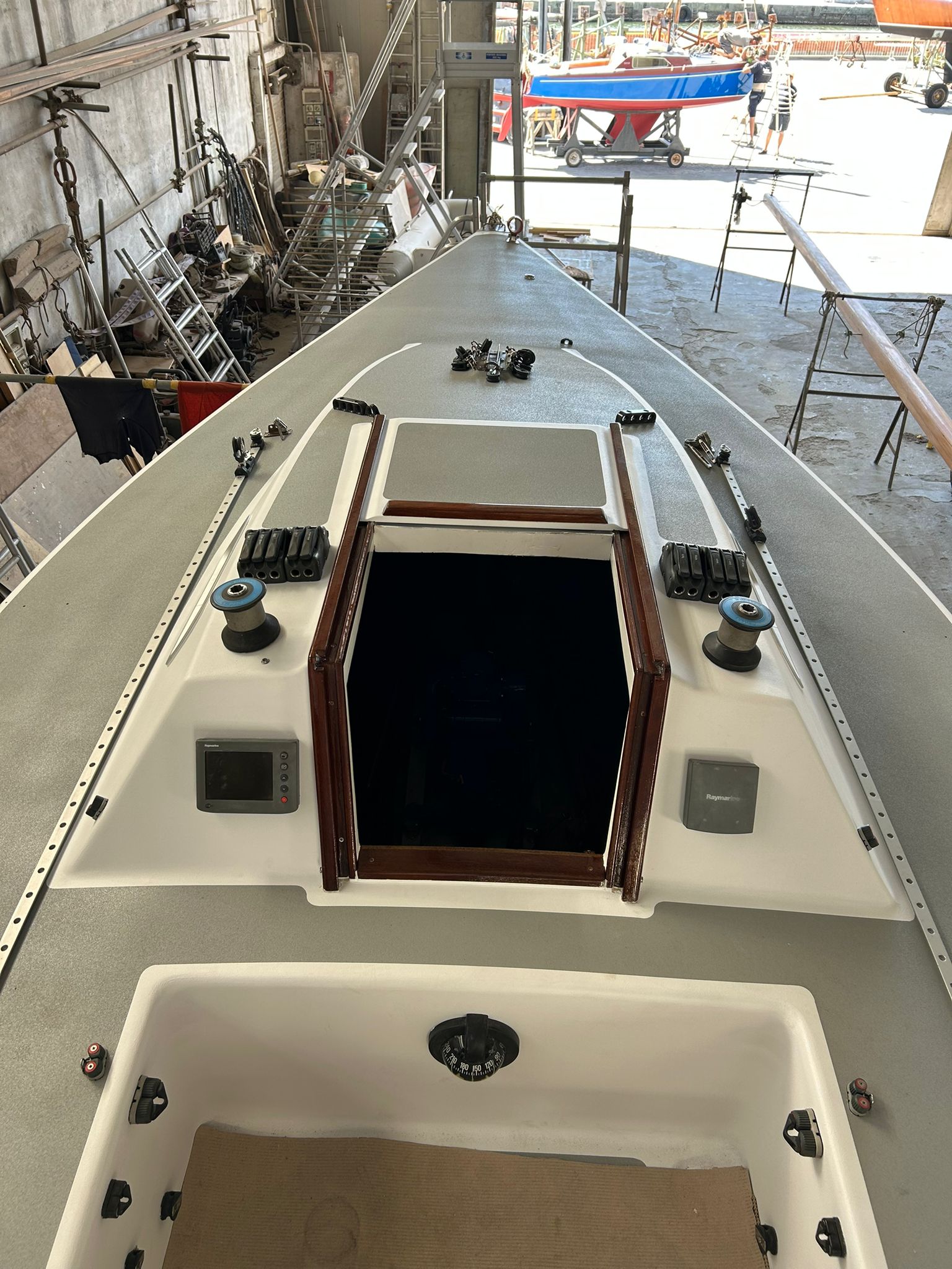 Assieme ad un amico nel deposito dei trattori della nonna, rivediamo tutti i compensati della coperta e il trasto della randa, mi stupisco delle mie competenze, e dopo un paio di mesi, alternando il lavoro ad una buona birra nelle calde giornate di agosto mi rendo conto di aver terminato l' opera tra risate e lunghe pause assieme agli amici più cari. Giusto in tempo prima che la nonna dell' amico venda la proprietà............e così perdiamo il "Garage" dalle ampie metrature....